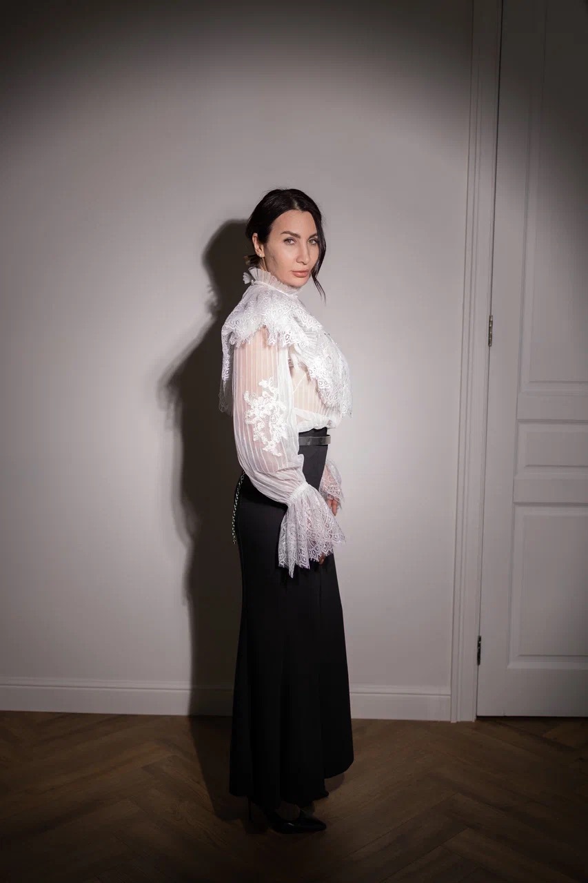 Роскошная блуза в белом цвете выполнена из невесомой сетки, плиссированной сетки и кружева и инкрустацией. Блуза декорирована кружевными элементами ручной работы. Дизайн блузы продуман таким образом, что вы точно будете самой запоминающейся героиней вечера, а может быть и дня. Всё зависит от ваших амбиций и желания блистать.