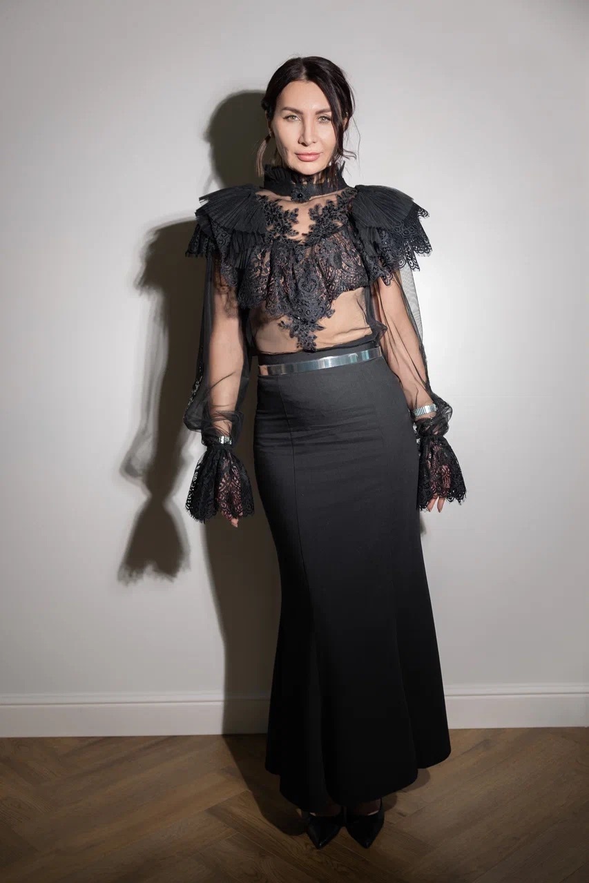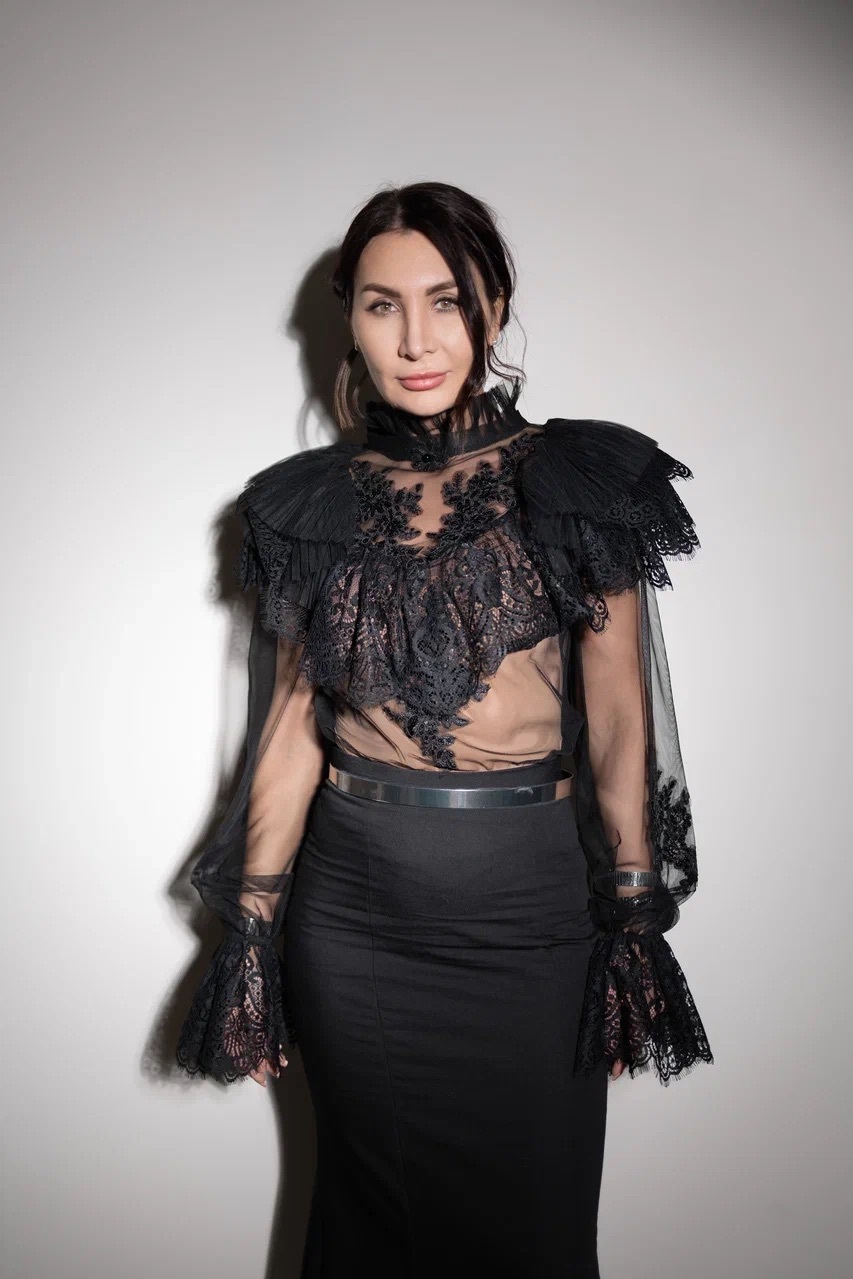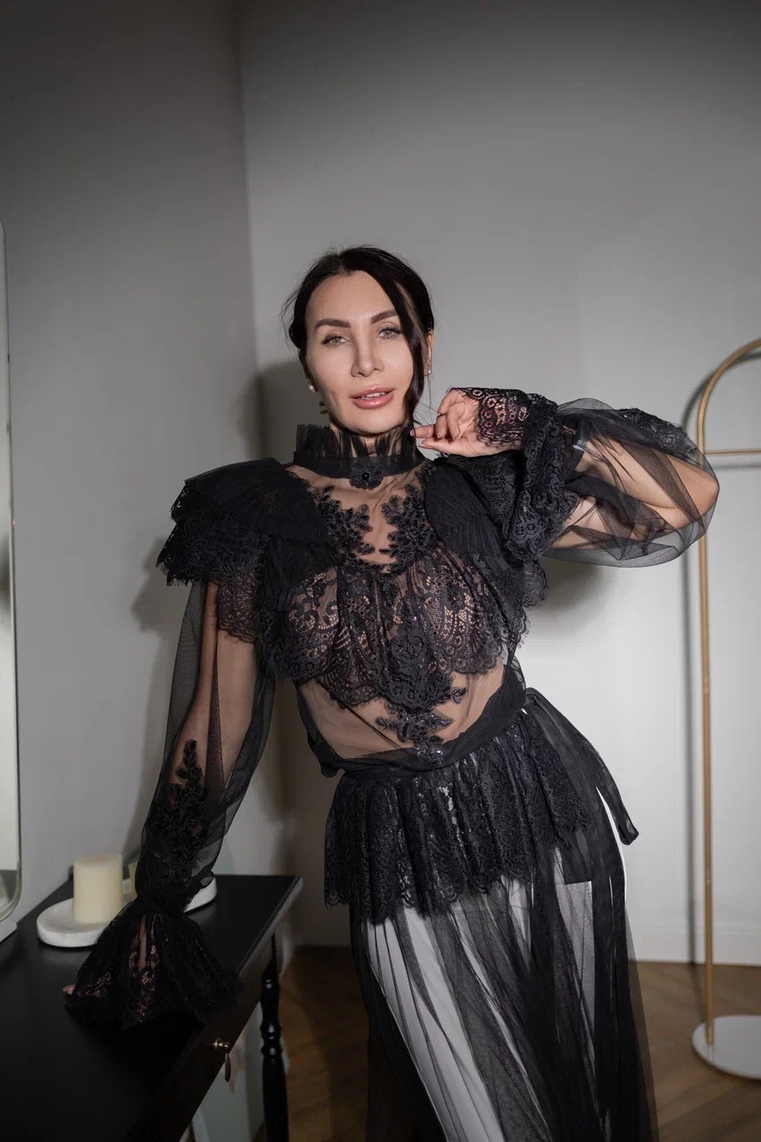 Роскошная блуза в чёрном цвете выполнена из невесомой сетки, плиссированной сетки и кружева. Блуза декорирована кружевными элементами ручной работы. Дизайн блузы продуман таким образом, что вы точно будете самой запоминающейся героиней вечера, а может быть и дня. Всё зависит от ваших амбиций и желания блистать.