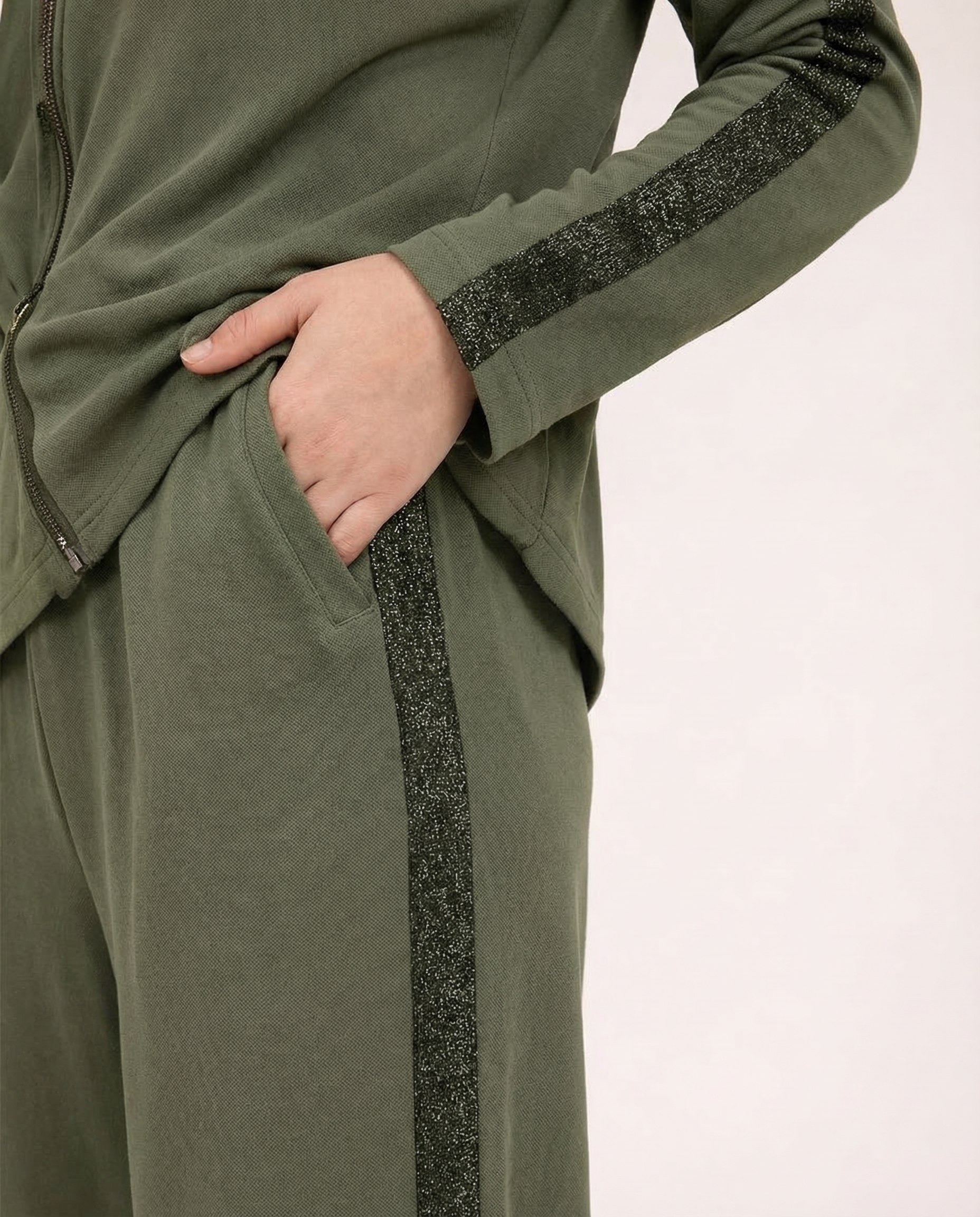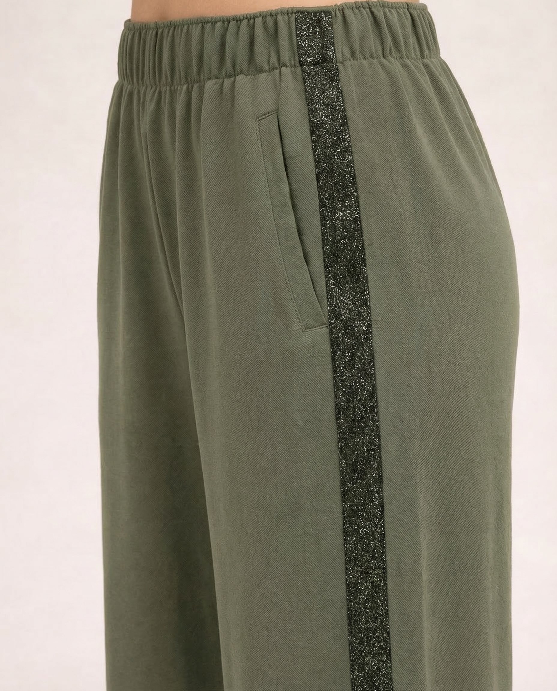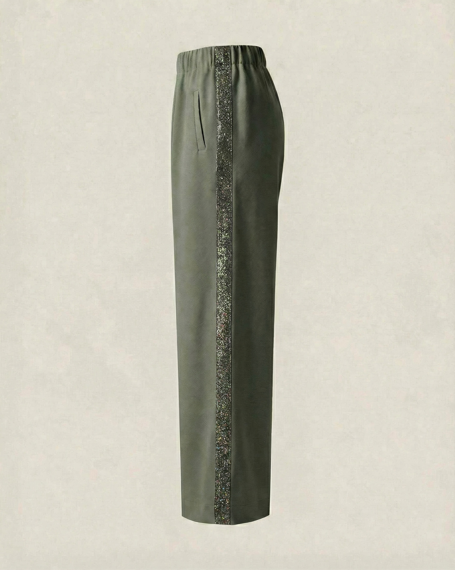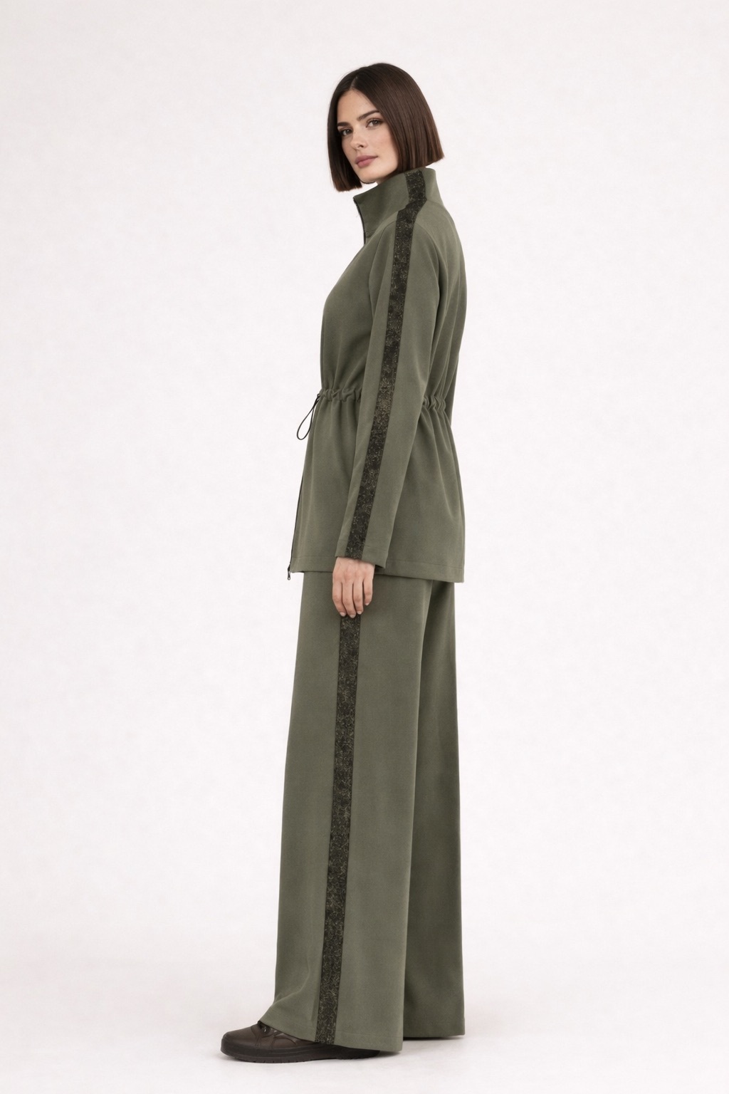 Прямые брюки из костюмной ткани средней плотности — идеальный баланс комфорта и элегантности. Материал отлично держит форму, не мнётся и не вытягивается, сохраняя аккуратный вид в течение дня. Эластичный пояс обеспечивает удобную посадку, а контрастные лампасы по бокам визуально вытягивают силуэт и добавляют образу динамики. Брюки легко сочетаются с разными элементами гардероба, а в комплекте со свитшотом создают стильный и современный костюм для повседневных и городских образов.