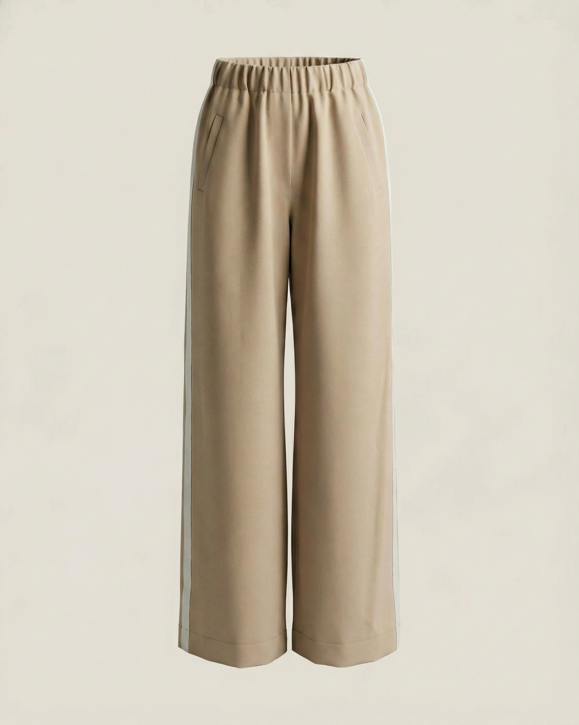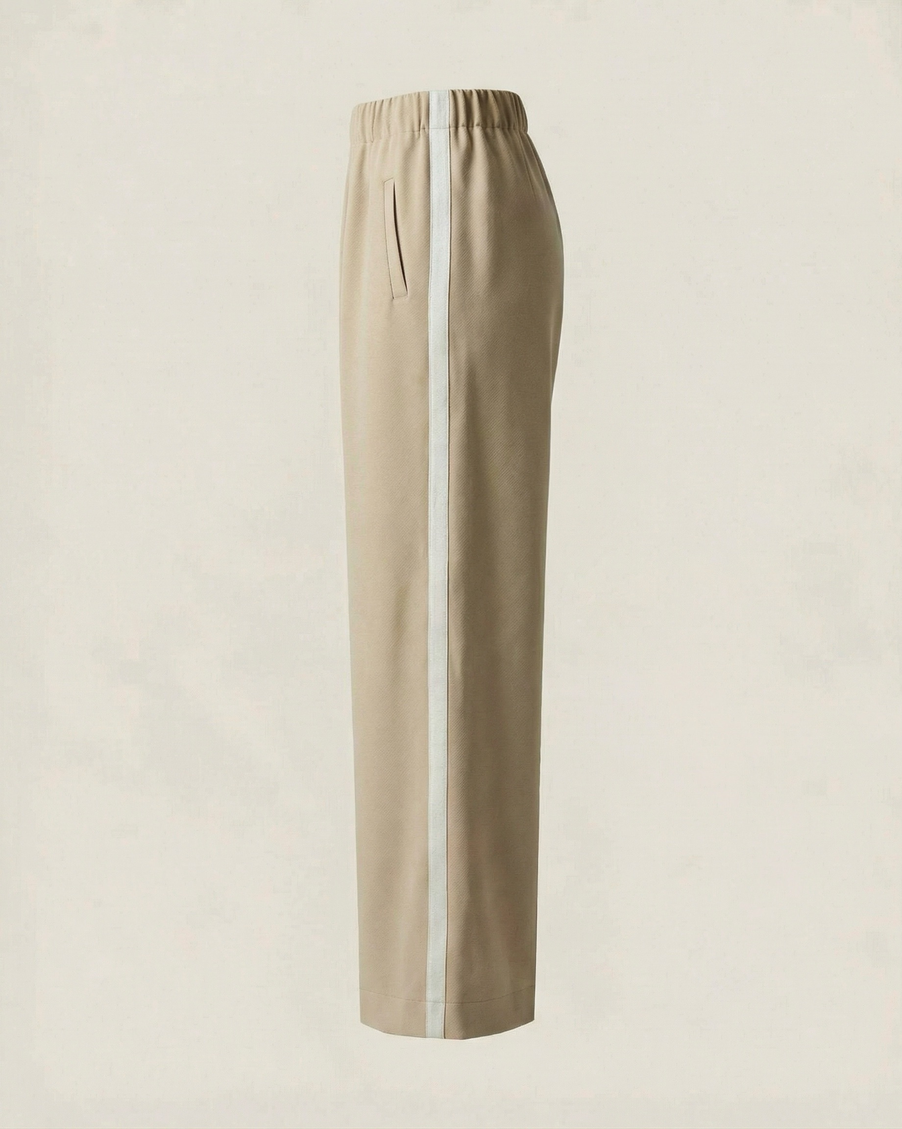 Прямые брюки из костюмной ткани средней плотности — идеальный баланс комфорта и элегантности. Материал отлично держит форму, не мнётся и не вытягивается, сохраняя аккуратный вид в течение дня. Эластичный пояс обеспечивает удобную посадку, а контрастные лампасы по бокам визуально вытягивают силуэт и добавляют образу динамики. Брюки легко сочетаются с разными элементами гардероба, а в комплекте со свитшотом создают стильный и современный костюм для повседневных и городских образов.