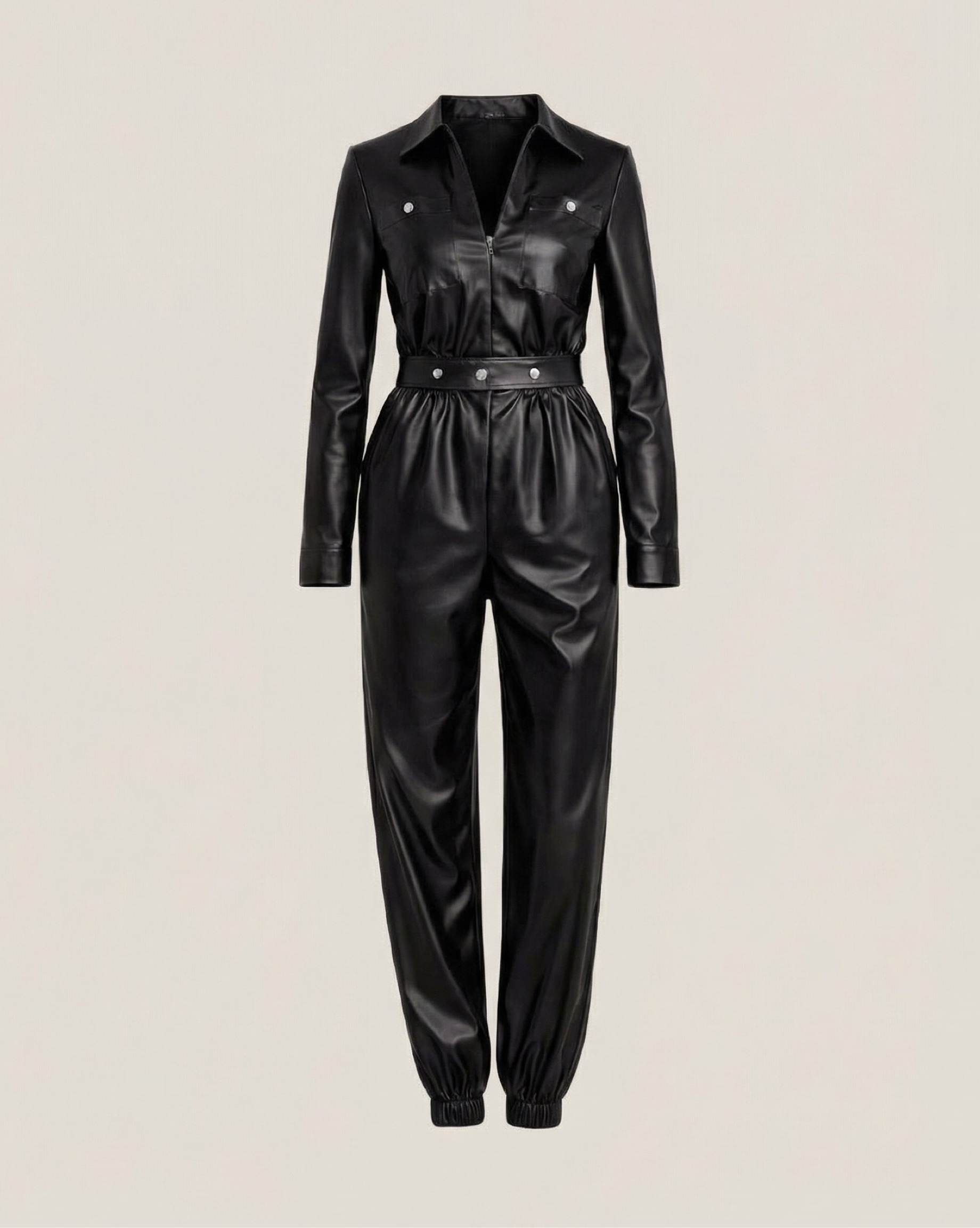 Комбинезон в черном оттенке из искусственной кожи - оригинальный предмет гардероба. Искусственная кожа дышит и приятна для тела. Отделка комбинезона металлическими кнопками. Застежка комбинезона на потайную молнию по груди. На рукавах манжеты, на брюках манжеты. Комбинезон комплектуется поясом. По желанию добавьте оригинальную баску на кнопках.