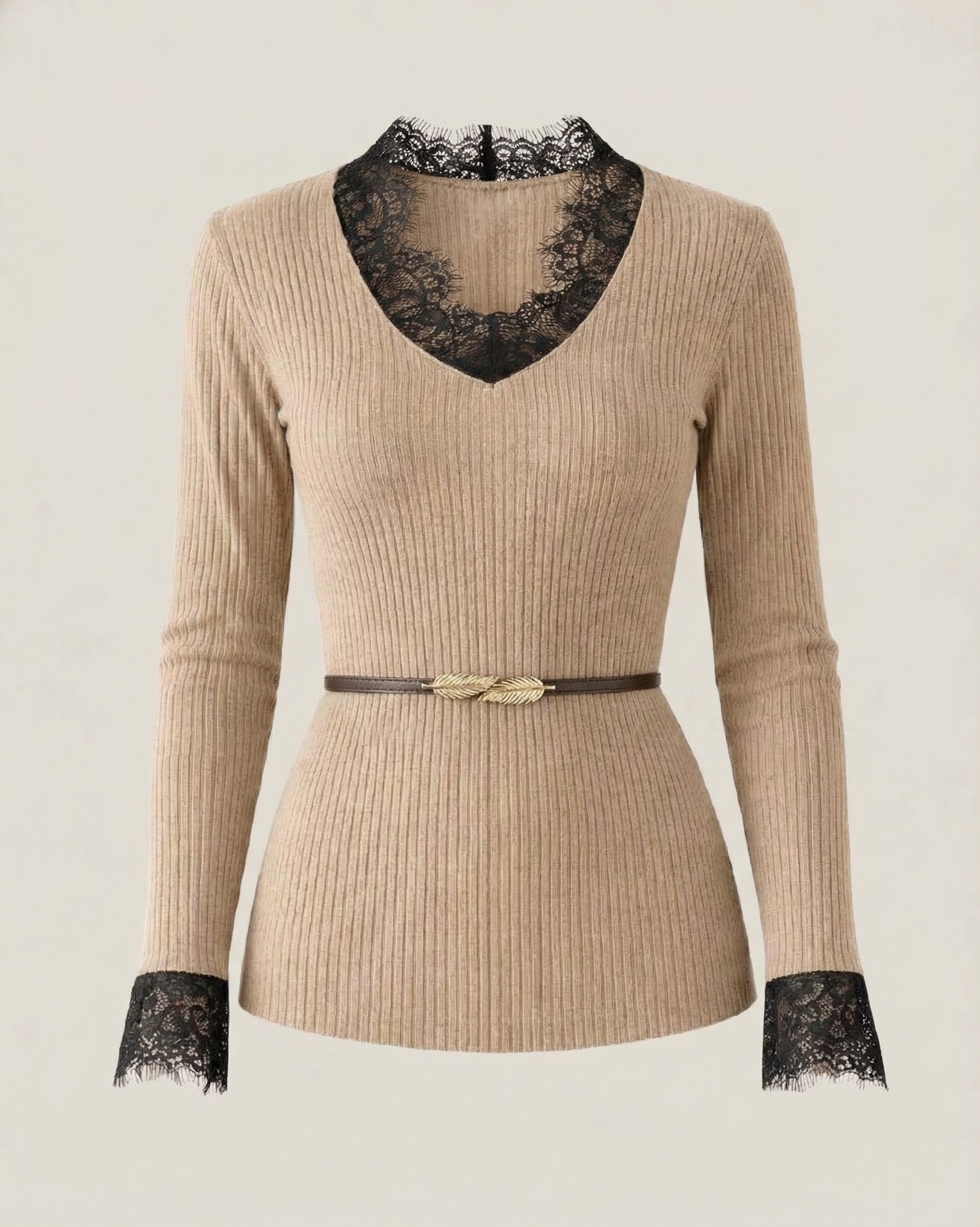 Элегантный джемпер прилегающего кроя создан для тех, кто ценит женственность в каждом штрихе. V-образный вырез оформлен тончайшим итальянским кружевом — деликатным акцентом, придающим образу утончённость и легкость.