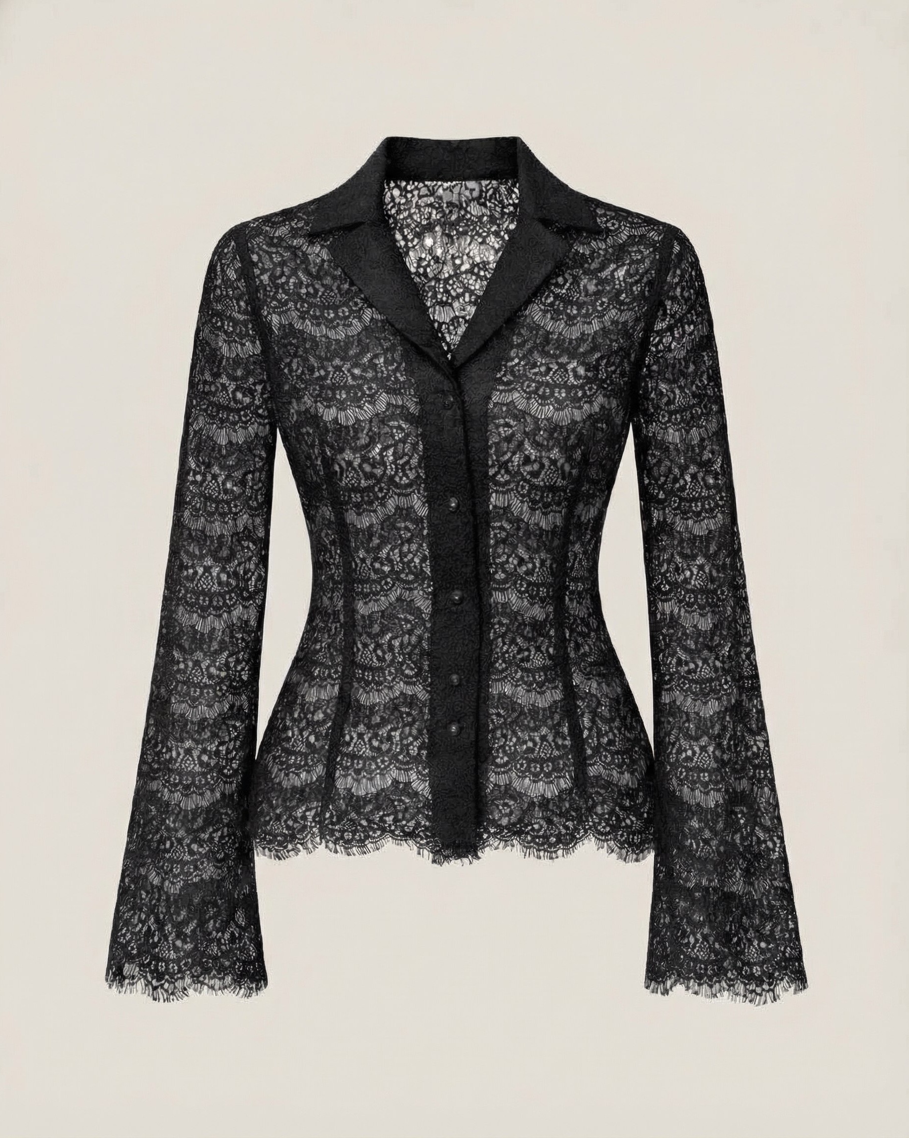 Кружево никогда не выйдет из моды - это женственно и роскошно. Оригинальная блуза выполнена из итальянского кружево высокого качества. Особенность кружева - уникальный рисунок и фигурный край. Блуза имеет приталенный силуэт, отложной воротник и застежку на пуговицы из жемчуга. Рукав блузы расклешенный и слегка удлиненный. Это придает блузе шарм и отлично оформляет зону запястья. Используйте блузу в повседневных и нарядных образах.