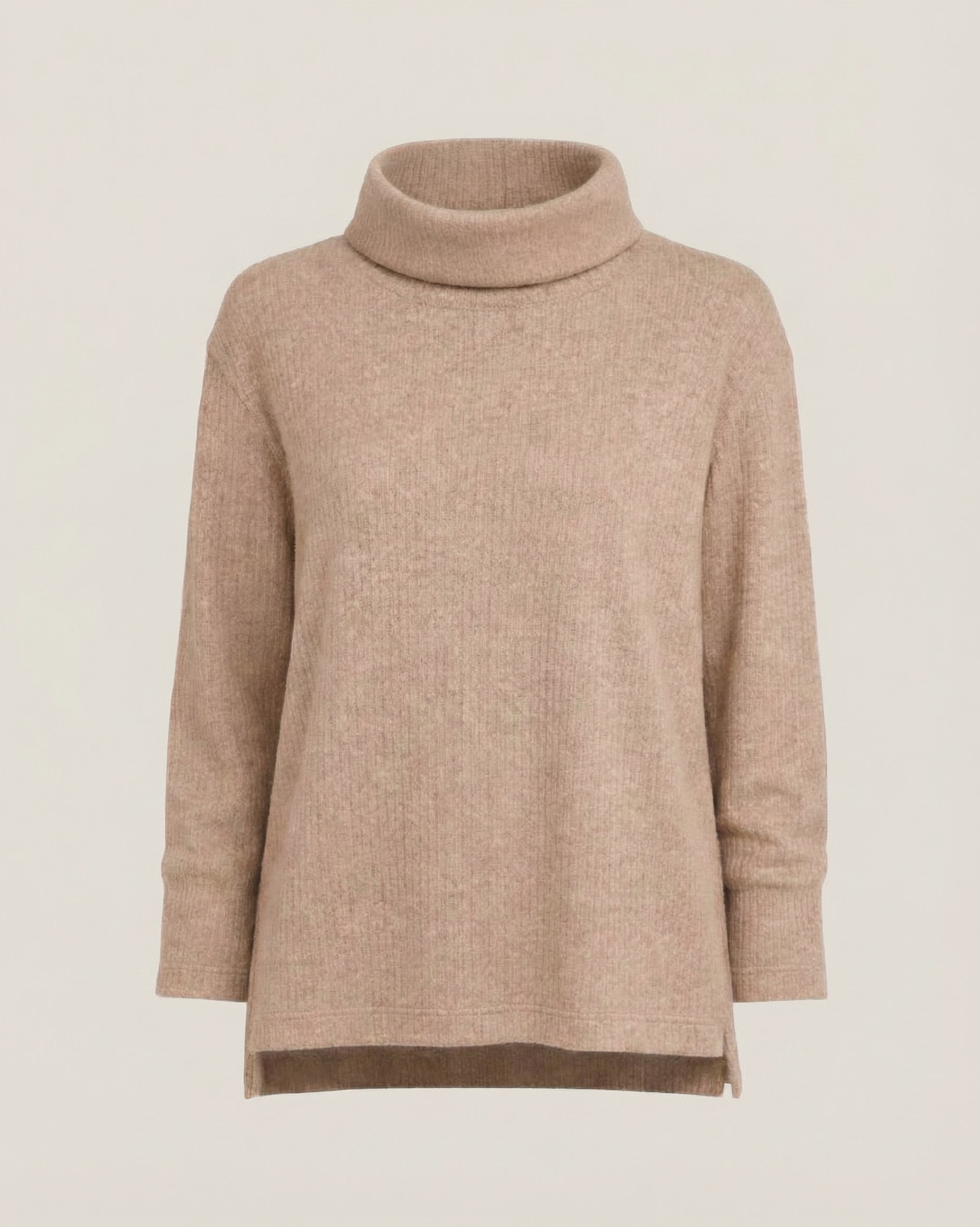 Оригинальный джемпер выполнен из трикотажа в составе которого есть шерсть ангорской овечки. Материал не колется и не закатывается, плавно струится по телу, обеспечивая тепло в прохладную погоду. Крой джемпера классический. Вырез в форме объемного горла согреет в проходную погоду. Оттенок джемпера универсальный и отлично впишется в гардероб.