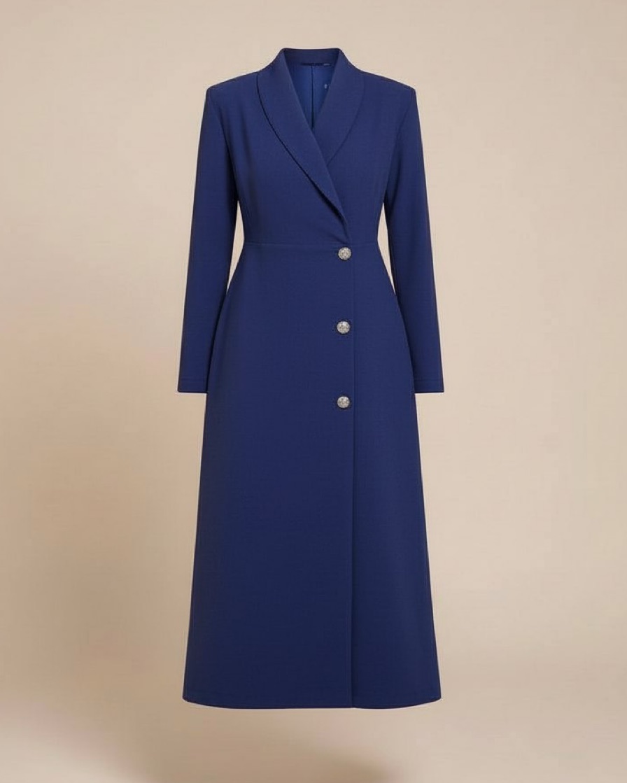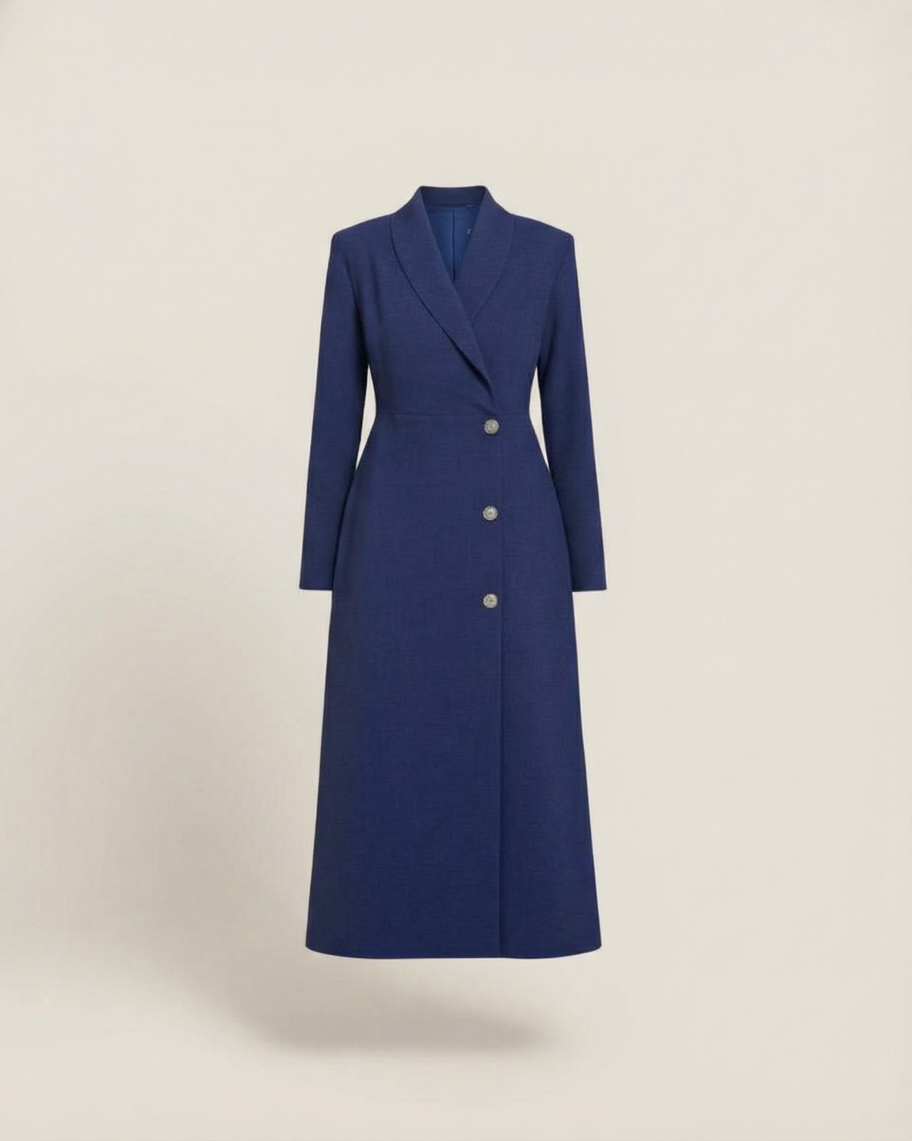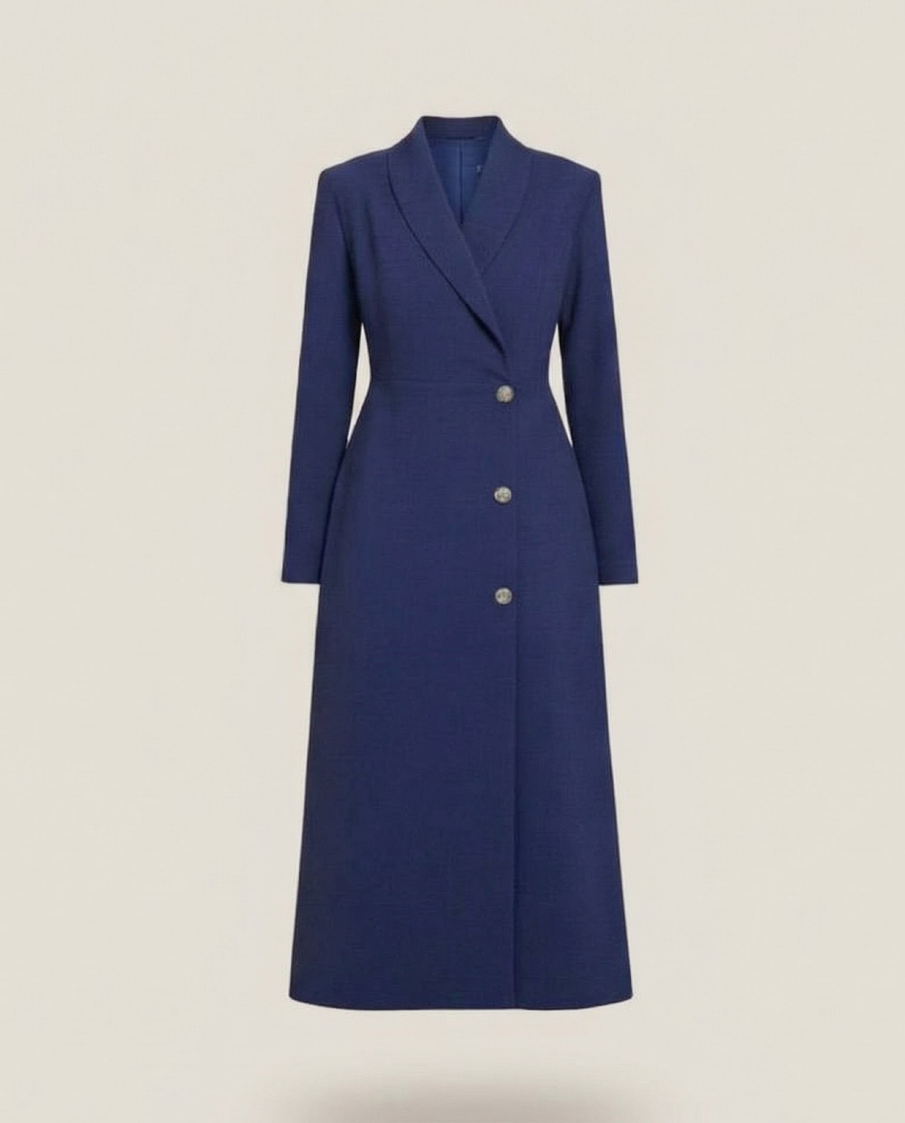 Элегантное платье миди с продуманным кроем: отрезная талия, двубортная застёжка, шалевый воротник и А‑силуэт. Металлические пуговицы и карманы в боковых швах подчёркивают статус и функциональность модели.