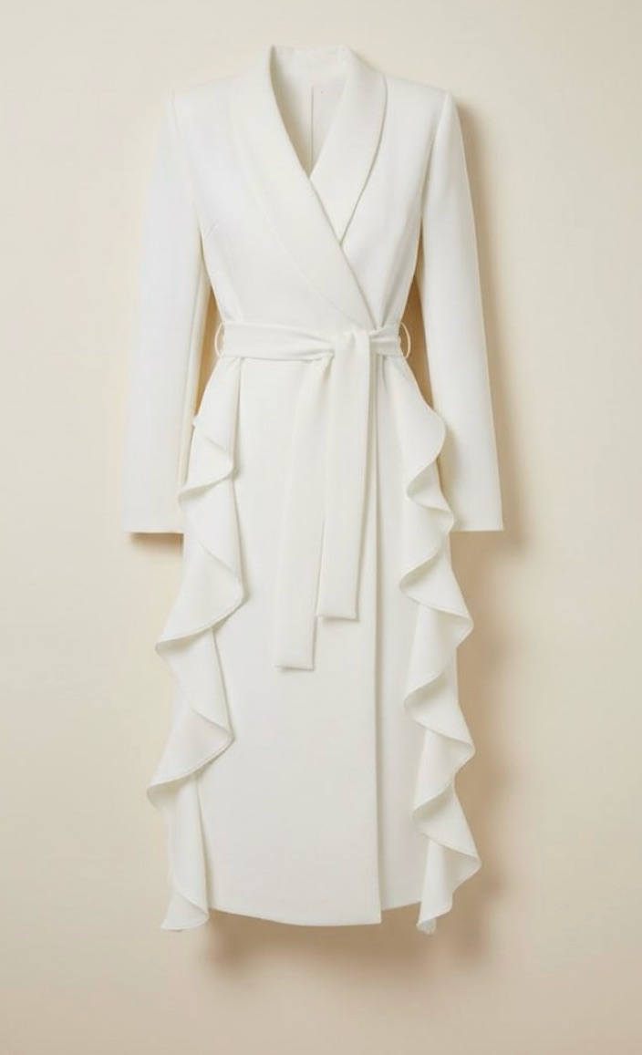 Декоративные воланы в швах юбки добавляют образу динамику и женственность. Идеальный выбор для торжеств, свадеб и особых выходов в элегантном, минималистичном стиле.