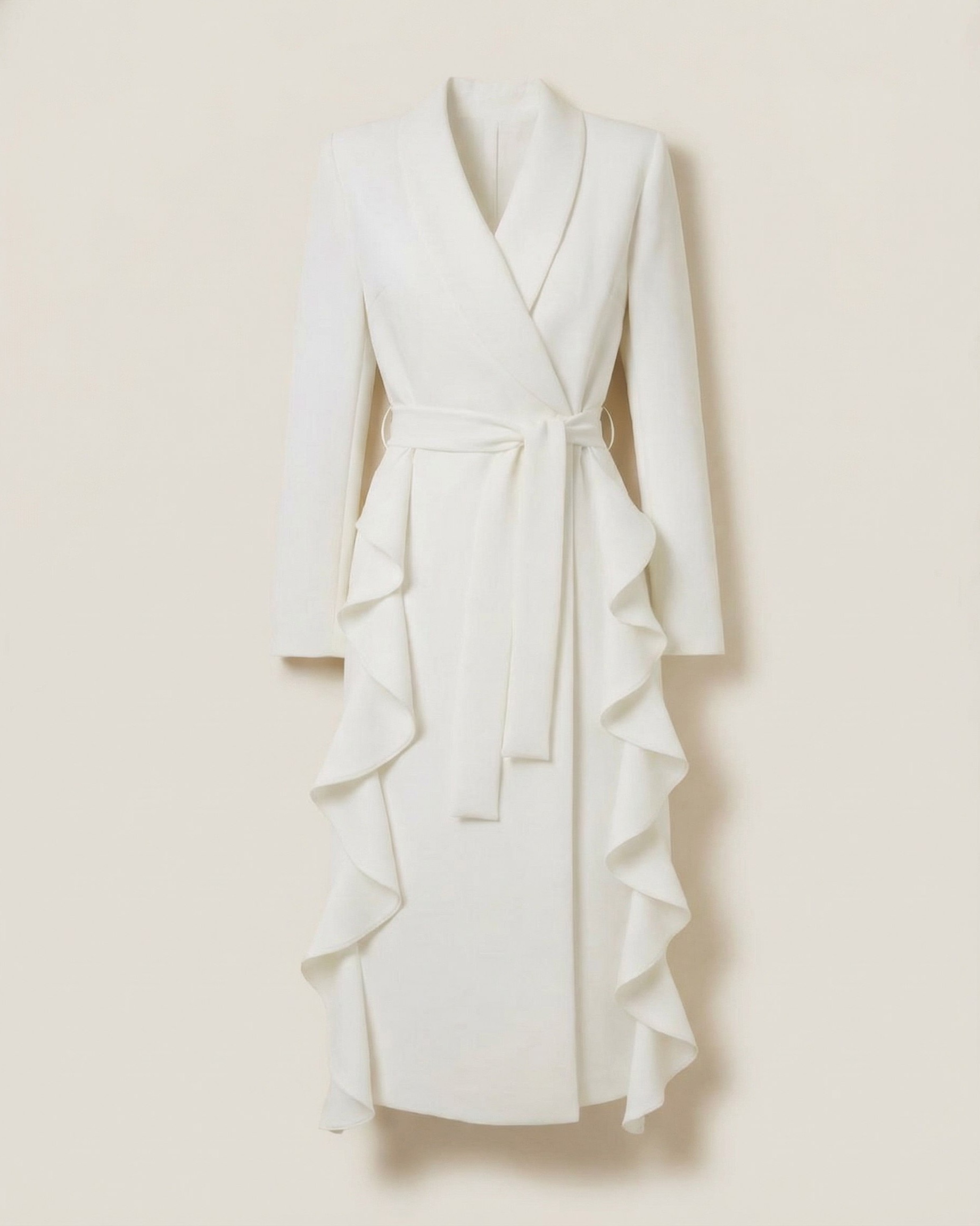 Платье пиджачного кроя на запах выполнено из костюмной ткани жемчужного оттенка — мягкой, дышащей и немнущейся. Подкладка из шелковистой вискозы придаёт форме чёткость и подчёркивает статус изделия.
