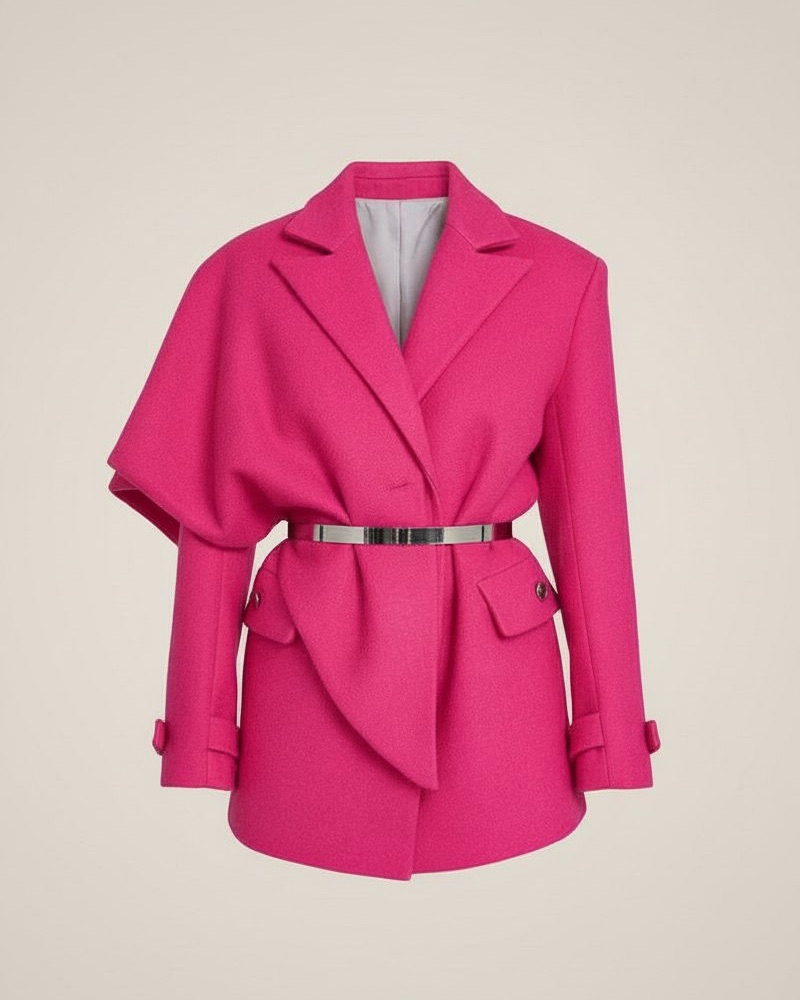 Акцентное укороченное пальто-пиджак из шерсти букле в насыщенном оттенке фуксии.