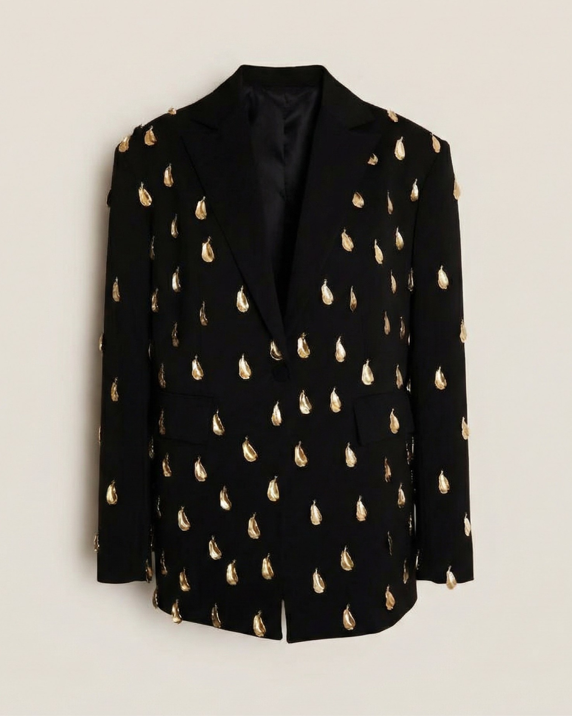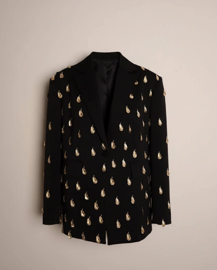 Этот пиджак создан для тех, кто выбирает безупречность и индивидуальность. Умеренный оверсайз придаёт образу лёгкую расслабленность, сохраняя чёткость линий, а однобортная застёжка на одну пуговицу визуально вытягивает силуэт и подчёркивает талию. Костюмная ткань средней плотности отлично держит форму, встроенные подплечники формируют архитектурную линию плеч, а боковые разрезы обеспечивают комфорт и современную посадку. Главный акцент — роскошный декор из золотых подвесок в виде перьев, каждая из которых пришивается вручную: около 130 элементов, создающих эффектный, статусный образ. Этот пиджак не дополняет образ — он становится его центром.