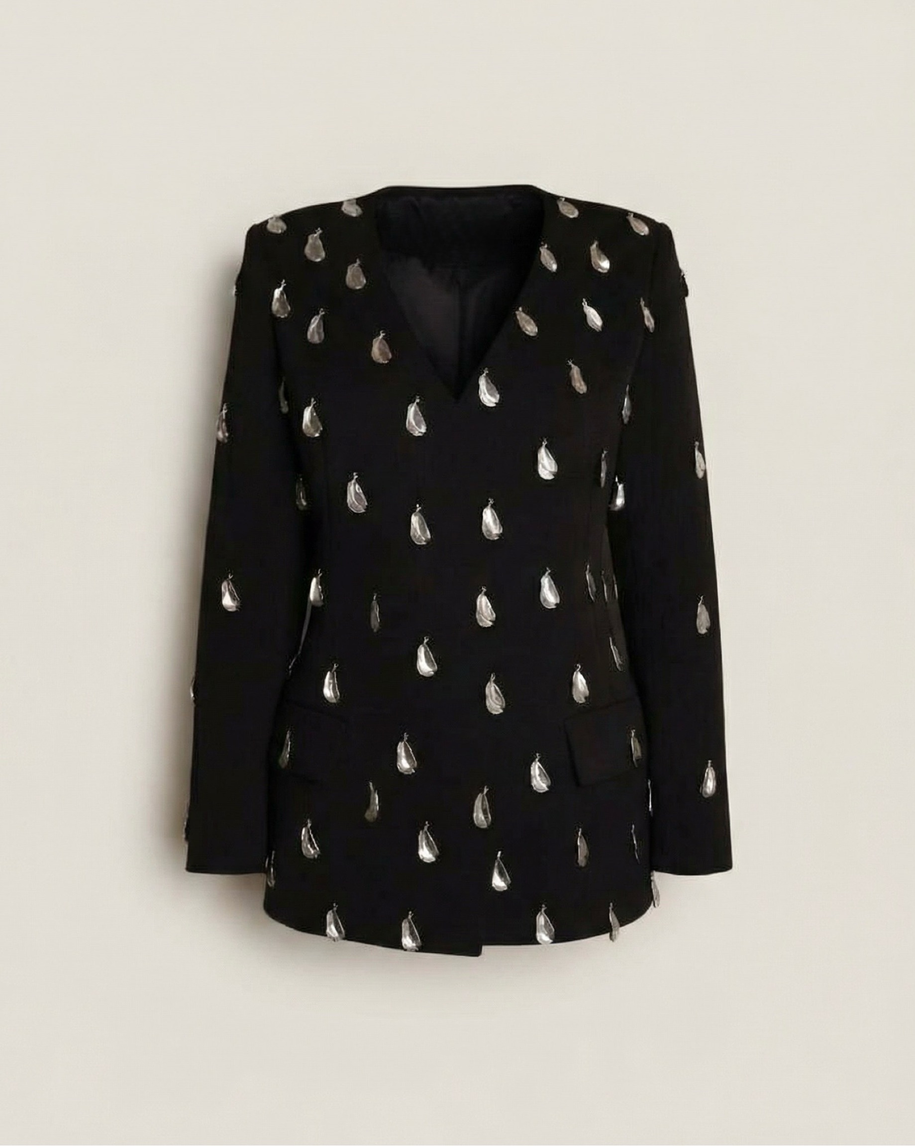 Этот пиджак создан для женщины, выбирающей элегантность и уверенность. Приталенный силуэт с идеальным запахом визуально вытягивает фигуру и подчёркивает талию, а отсутствие лацканов делает образ особенно утончённым. Встроенные подплечники формируют безупречную линию плеч и благородную осанку, костюмная ткань средней плотности держит форму и сохраняет комфорт в течение дня. Двубортная застёжка на кнопках обеспечивает идеальную посадку, а декор из серебряных подвесок в виде перьев добавляет образу статусную выразительность и лёгкий акцент роскоши.