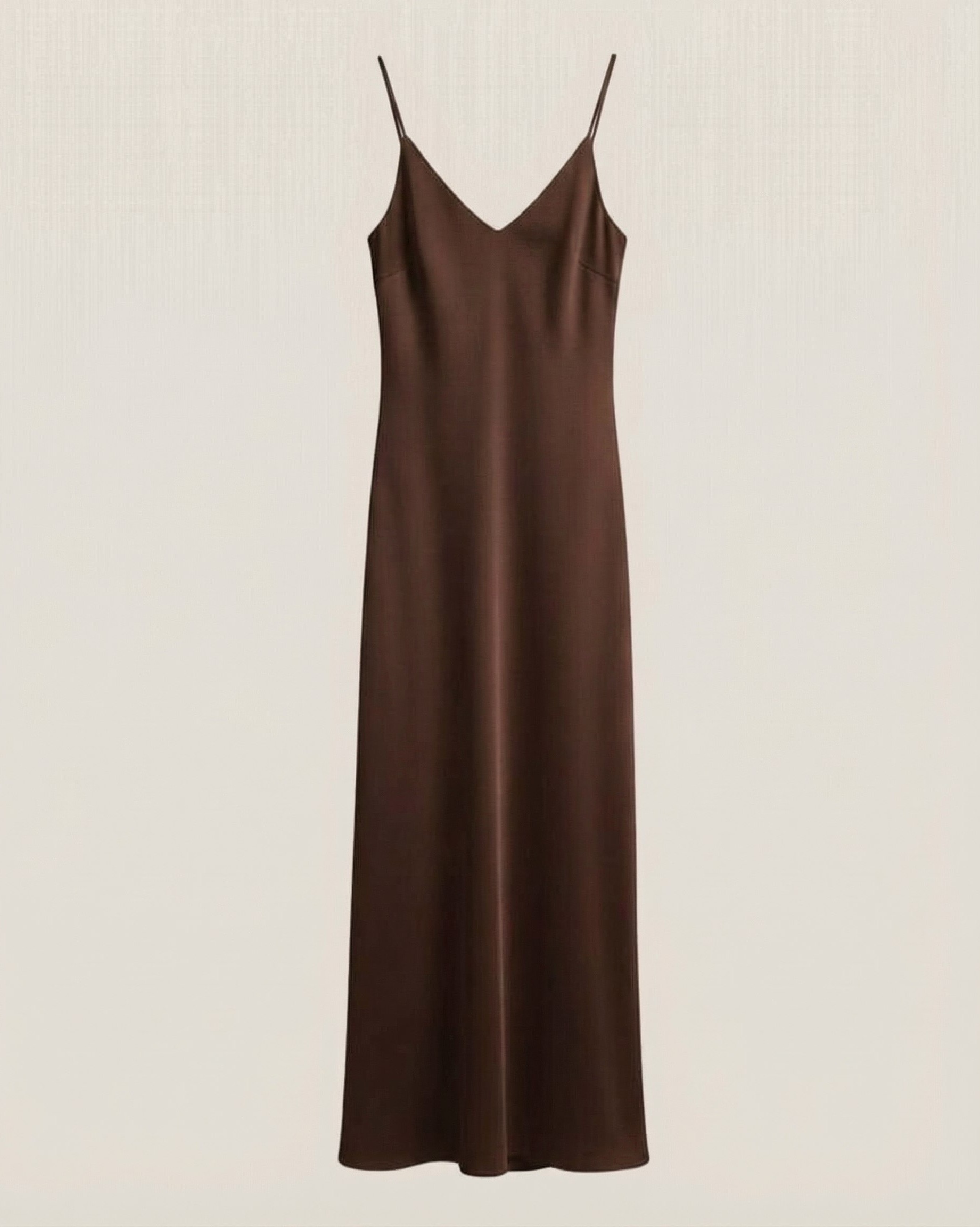 Регулируемые тонкие лямки позволяют идеально подстроить посадку, а приталенный силуэт и макси-длина подчёркивают линии тела. Глубокий шоколадный оттенок добавляет образу благородства и универсальности.