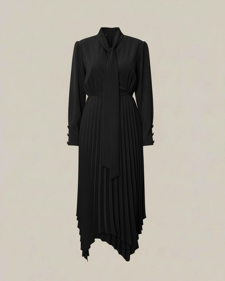 Чёрное платье, воплощающее элегантность в каждом движении. Глубокий запах формирует изысканный и утончённый силуэт, оставаясь при этом безупречно закрытым — каждая деталь продумана до мелочей.