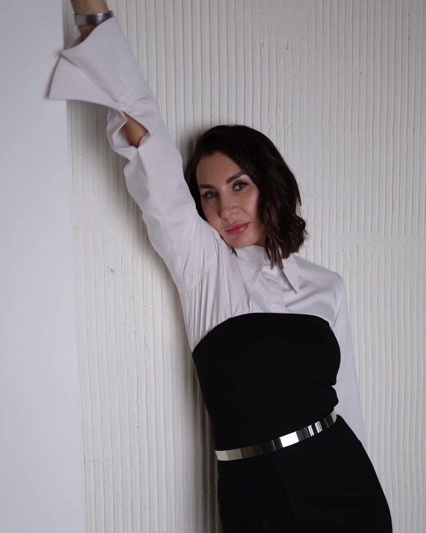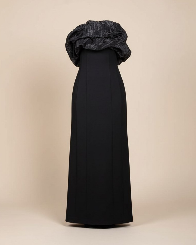 Корсетное платье из плотного премиального джерси формирует идеальный силуэт и подчёркивает фигуру. Съёмный объёмный элемент из жатой ткани на груди позволяет мгновенно менять настроение образа — от сдержанного минимализма до выразительного couture.