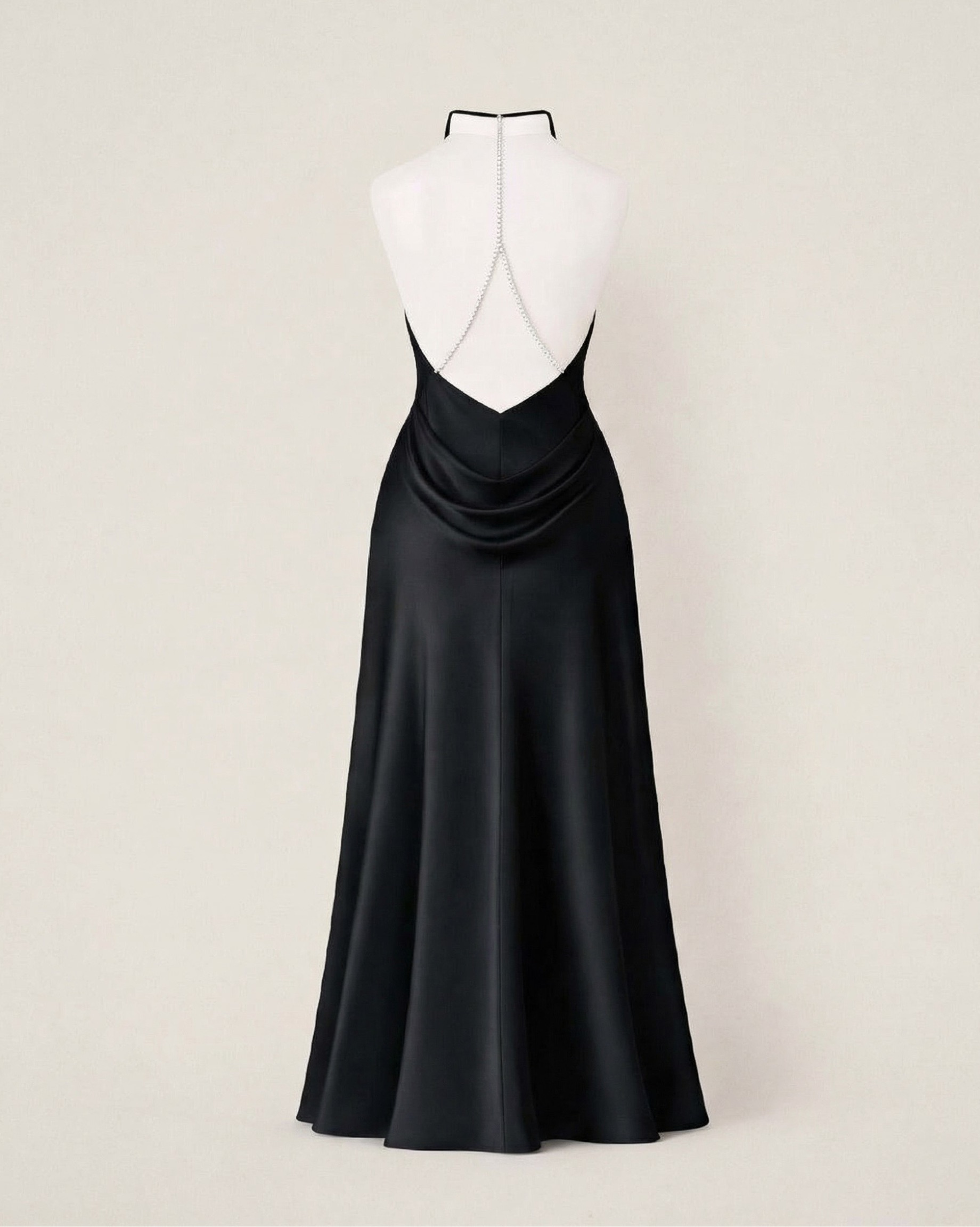 Жемчужная цепочка по спинке заменяет украшение, мягкая драпировка «качелькой» и струящийся шёлк придают образу лёгкость и чувственность.