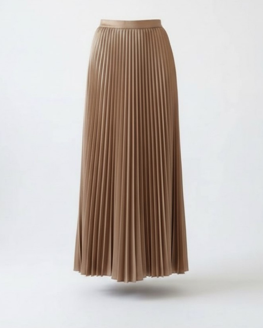 Юбка плиссе выполнена из золотого тяжелого сатена. Даже плиссировка здесь стройнящая, так как складка расширяется к низу. Это трендовый и необычный эффект. Плиссировка изготавливается в лаборатории IVLE вручную и будет служить вам верой и правдой.