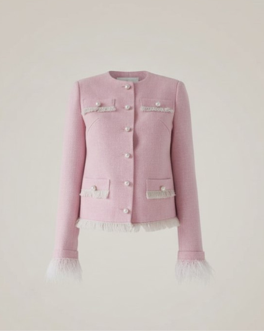 Роскошный жакет оттенка нежного розе выполнен из мягкого твида с деликатным ёлочным плетением и создан для тех, кто ценит безупречный стиль и внимание к деталям: полуприлегающая посадка подчёркивает линию плеч и формирует женственный силуэт, жемчужные пуговицы добавляют французский шарм, декоративная бахрома и воздушные перья создают изысканную игру фактур, превращая жакет в выразительный акцент образа. Универсальный и эффектный, он одинаково гармонично впишется в деловой, вечерний и кэжуал‑гардероб, становясь современной интерпретацией утончённой женственности.